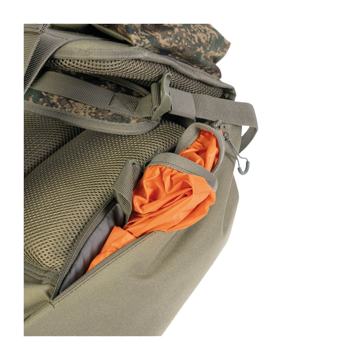 Su tejido es silencioso e impermeable, contando con un confort y ventilación inmejorables gracias a su espalda acolchada con piezas de malla transpirable, permitiendo regular la altura mediante tirantes, correa ajustable deslizante para el pecho (con silbato de emergencia y brújula) y cinturón con ceñidores.